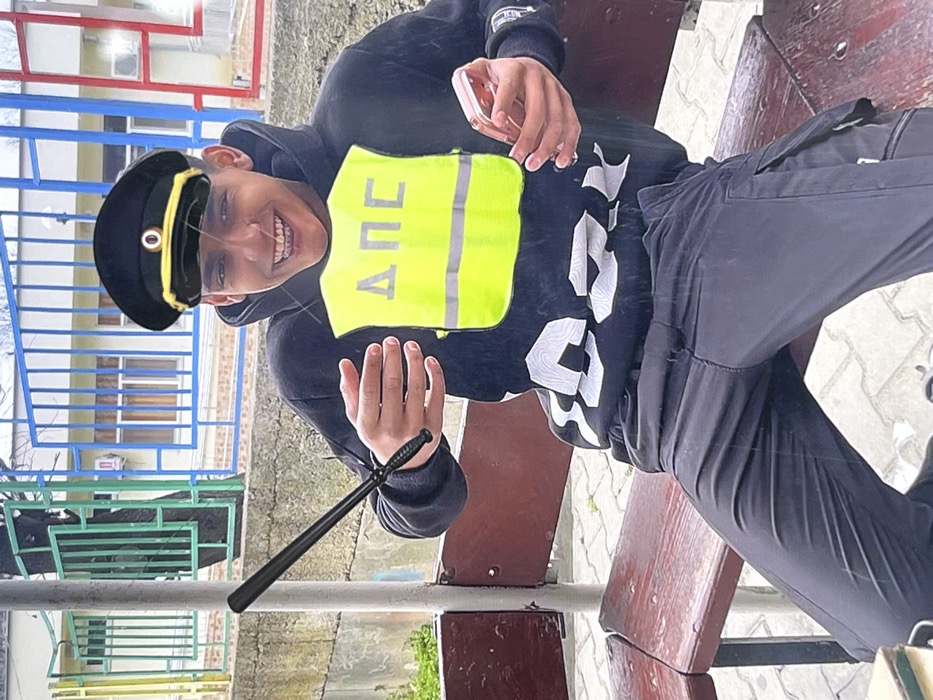 A young male is depicted seated on a wet, dark brown wooden bench with a metallic frame. He is smiling broadly, revealing upper dental braces. He wears a black hooded sweatshirt with a white patterned graphic, black trousers, a bright yellow reflective vest with the Cyrillic letters "ДПС" prominently displayed on the chest, and a dark peaked cap featuring a yellow band and a national emblem consistent with Bulgarian traffic police attire. In his right hand, he holds a black, baton-like object, while his left hand holds a light-colored smartphone. Visible water droplets on his clothing and the bench indicate recent precipitation. The background features a light-colored building with multiple windows behind a multi-colored metal fence (green lower, blue upper), and sparse green vegetation. The ground is paved. The scene occurs in an outdoor public area, likely a park or schoolyard, within the city of Stara Zagora, Bulgaria. A precise address within Stara Zagora cannot be determined from the image.
