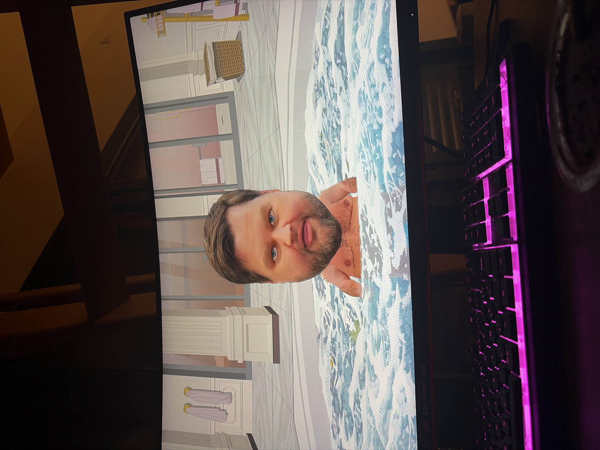 The image displays a computer monitor positioned on a wooden desk within a dimly lit indoor environment, specifically in Rosny-sous-Bois, France. The monitor, identified as an AOC brand, shows a digitally rendered scene of a male figure submerged from the chest upwards in a bubbling, light blue jacuzzi. The figure has fair skin, blue eyes, brown hair, a brown beard, and visible chest hair. His expression is neutral, with lips slightly parted. The jacuzzi water features white foam and ripples, with small green and yellow objects floating within. The background of the digital scene depicts a stylized, luxurious bathroom or spa interior with light-colored walls, white classical columns, and a tiled floor. Two light purple towels hang on golden hooks on the left wall. A dark-framed glass partition is visible in the center-right, and a woven brown laundry hamper with a white liner is positioned on the right. Below the monitor, a black mechanical keyboard with bright magenta backlighting illuminates the keys, including an "Entrée" key on the right side. A dark cable extends from the keyboard to the right. A dark, partially obscured container rests on the desk in the bottom right corner. The room's ceiling above the monitor features warm-toned wooden beams or paneling.