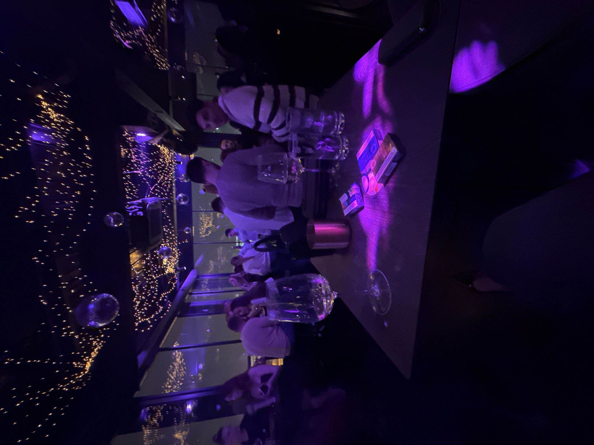 The image depicts an indoor nightlife scene at The Muse Rooftop Bar & Dinner in Sofia, Bulgaria, characterized by a dark ambiance illuminated by decorative lighting. The ceiling features numerous small, warm-toned string lights and multiple mirrored disco balls. Large windows in the background reveal the blurred lights of a city skyline at night, indicating a high-rise location. In the immediate foreground, a dark table is partially visible, strongly illuminated by a purple light source. On this table, a clear wine glass containing a clear liquid is positioned on the left. To its right, a metallic, copper-colored cylindrical object is present. Further right, two clear drinking glasses, both containing clear liquid, are visible. Scattered across the table are three small rectangular boxes, appearing to be cigarette packs, with one clearly displaying the brand "TERRA". A dark smartphone or similar electronic device rests on the far right edge of the table. In the midground, beyond the table, a group of approximately ten to fifteen individuals, both male and female, are present, either standing or seated, engaging in social interaction. One male subject, positioned slightly right of center, wears a white shirt with dark horizontal stripes and looks directly towards the camera. To his left, another male subject is seen from behind, wearing a light-colored top. Other individuals are distributed throughout the background, obscured by dim lighting and soft focus, some appearing to hold drinks. The overall scene suggests a social gathering within an upscale entertainment venue.