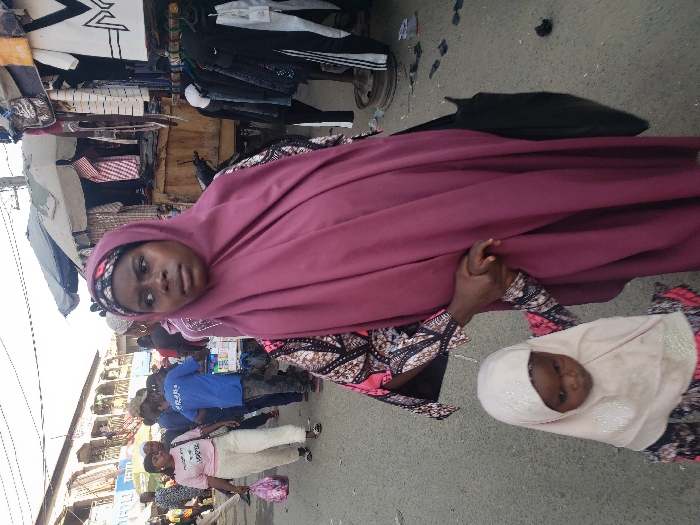 This image depicts a bustling market street in Suleja, Nigeria. In the foreground, a woman in a long, plum-colored hijab over a patterned dress holds the right hand of a young child. The woman's face is visible, with her gaze directed towards the viewer's left. The child, wearing a light beige hijab and a patterned dress matching the woman's, looks downwards. The woman carries a black bag on her left side. To the immediate right, a vendor stall operates under an awning, displaying various clothing items including dresses, t-shirts, and track pants on hangers and a wooden stand. A black and white garment with a prominent 'M' logo is visible among the merchandise. To the left, another stall presents packaged goods on a table. In the mid-ground, multiple pedestrians are visible on the paved street, including a woman in a pink t-shirt and white pants carrying a pink bag, and a man in a blue t-shirt. The background features multi-story buildings and a network of overhead power lines. The street surface shows scattered debris.