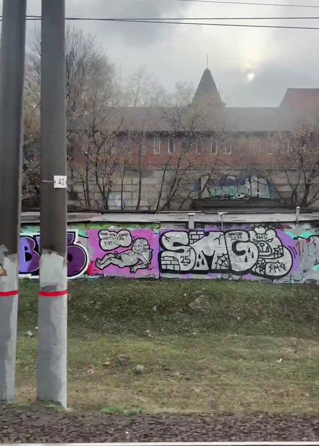 From the window of a moving train, a view of a concrete wall covered in graffiti is seen. Behind the wall is a building with a distinctive, pointed spire, surrounded by bare trees. The weather appears overcast. The train tracks are visible in the foreground, and utility poles occasionally interrupt the view. Further back, some modern high-rise buildings can be seen on the horizon along with an industrial chimney.