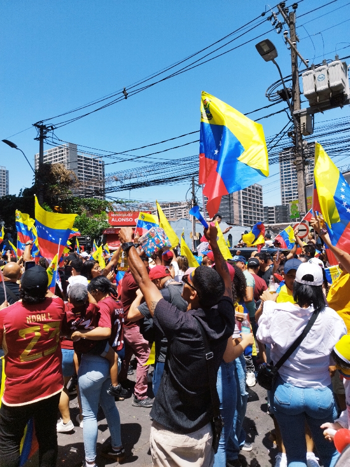 - "The scene depicts a dense crowd of people gathered on an urban street in Santiago, Chile, under a clear blue sky" by FM-ZqBmD2, licensed under CC BY 4.0