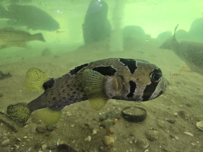 - "A spiny porcupinefish swims in murky green water" by FM-evMpA2, licensed under CC BY 4.0