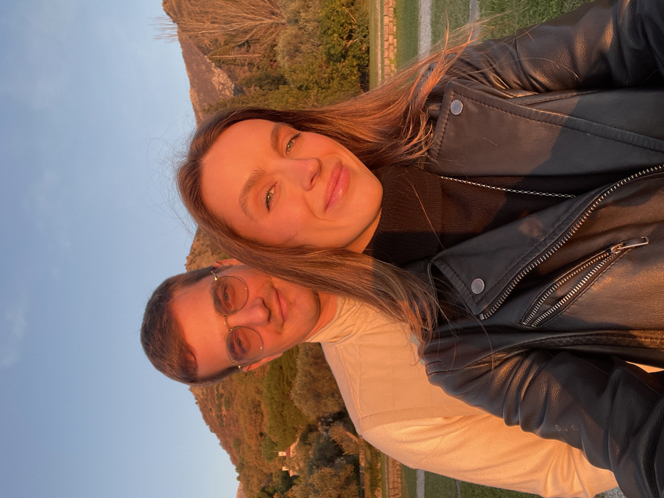 The image captures a selfie of two individuals, one female and one male, illuminated by warm, golden-hour light