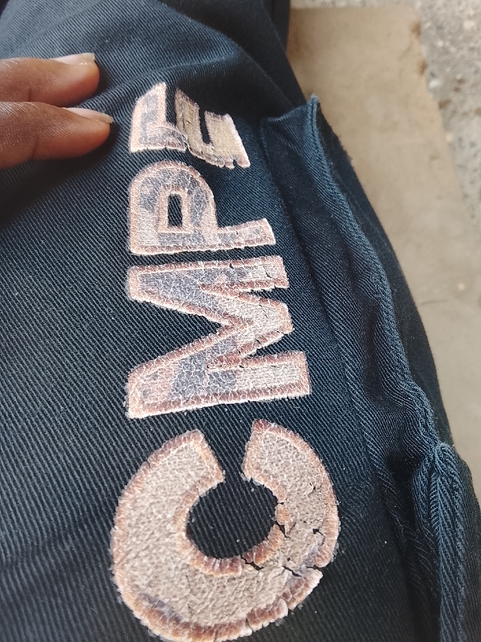 A close-up, high-angle image depicts dark blue woven fabric, possibly a garment, featuring four light beige or tan embroidered letters that spell "CMPE". The letters exhibit a distressed texture with visible cracks and wear. A hand with dark skin, specifically a thumb and part of an index finger, rests on the upper-left portion of the fabric, adjacent to the letter "C." The background consists of an out-of-focus light gray or tan surface, consistent with a concrete ground. The scene is located in Rumuekini, Nigeria.