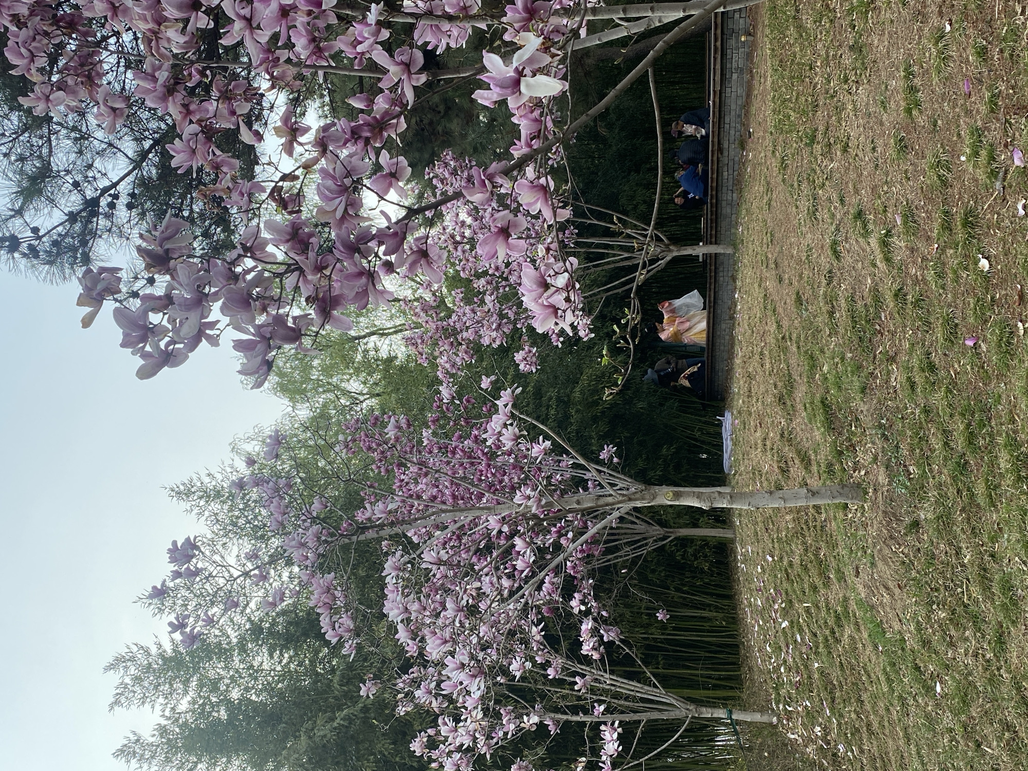 park scene in Haidian District, China. Two young trees, possibly magnolia trees, are in bloom with pink and white flowers. Behind the trees, there is a line of tall, thin bamboo. To the right of the trees is a grassy area with fallen flower petals scattered on the ground. In the background, a small group of people are sitting on a low brick wall. The sky is overcast.