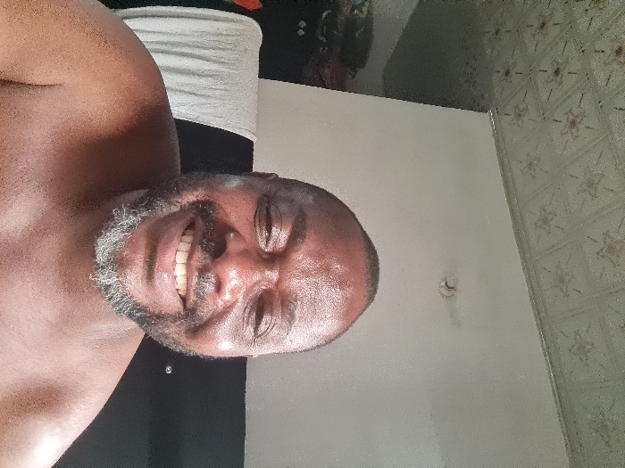 An image displays a smiling, dark-skinned man with a graying beard. He appears to be indoors, against a wall with a patterned tile border. The wall behind him is a plain, light color. The man's skin is shiny, possibly due to perspiration or oil. Part of a dark shirt and a white fabric can be seen behind his shoulder. The image is slightly tilted.