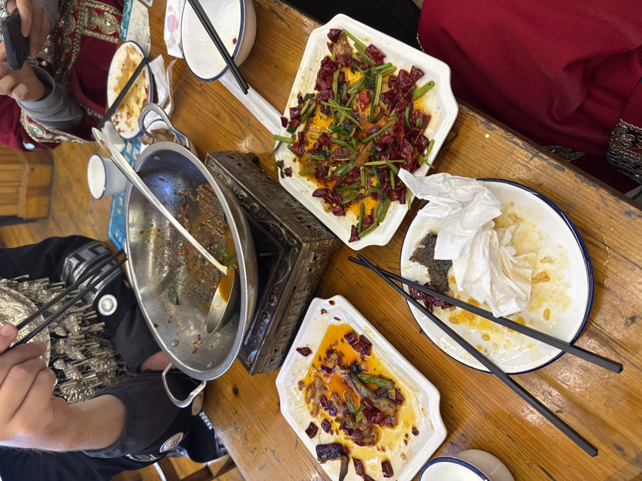 The image depicts a dining table scene in Fenghuang, China, following a meal