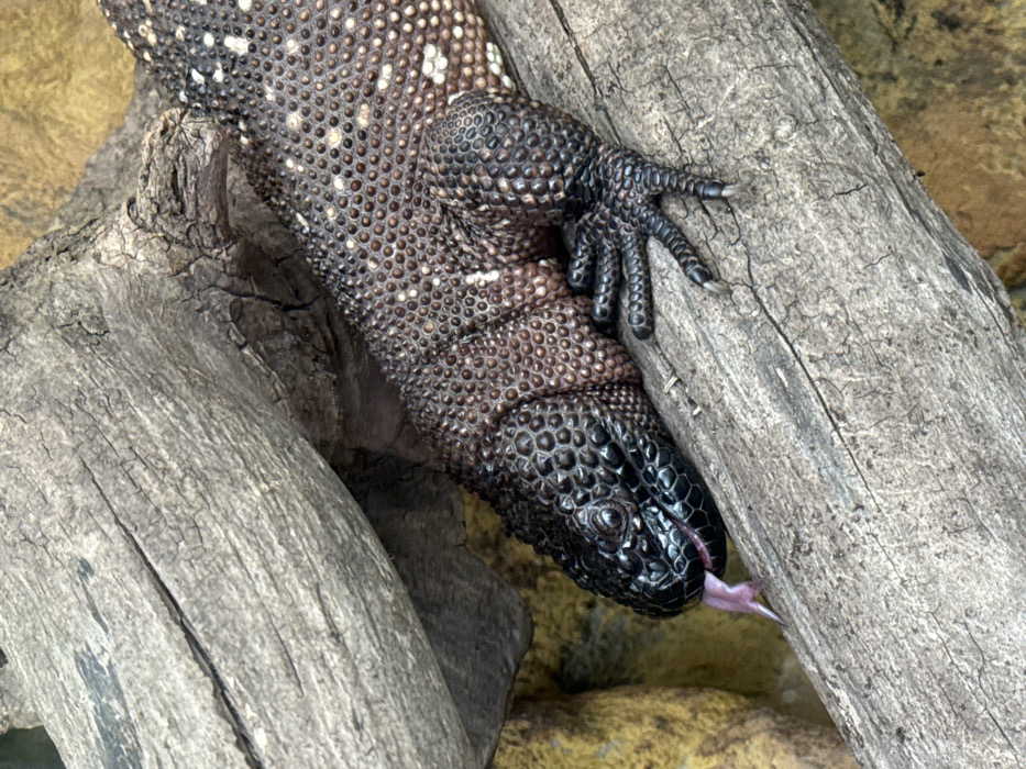 - "The scene depicts a single Gila monster (Heloderma suspectum) or Mexican beaded lizard (Heloderma horridum) positioned on a large, weathered tree log within an enclosure" by FM-nJ3pG2, licensed under CC BY 4.0