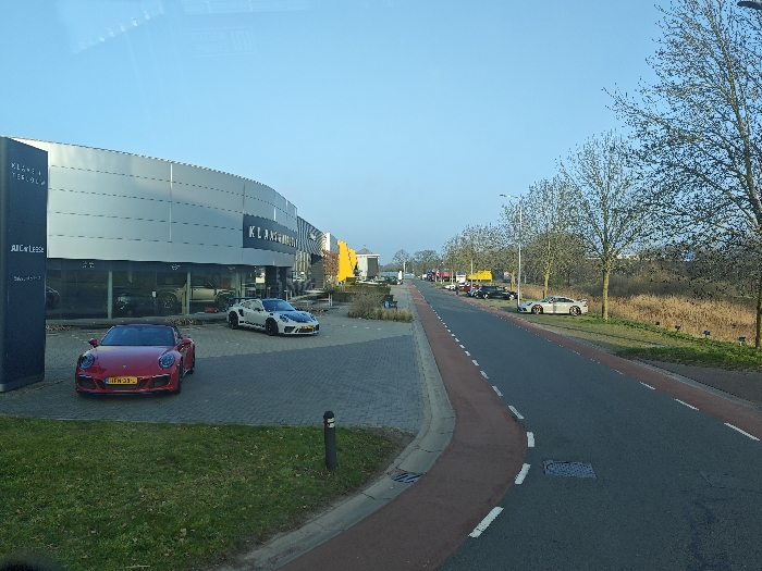 The image displays an exterior scene of the Klaasen & ter Beek B.V. car dealership at Parallelweg 110 in Wierden, Netherlands, under clear daylight. In the foreground, a red Porsche 911 convertible, bearing Dutch license plate HFN-33-J, is parked on a dark gray paved surface. Adjacent to it, a tall, dark vertical sign identifies "KLAASEN & TER BEEK" and "All Car Lease." The dealership building itself is a modern, multi-story structure with a curved facade composed of gray and white panels and large glass display windows revealing multiple luxury vehicles inside. Parked on the paved area directly in front of the building is a white Porsche 911 GT3, featuring black and blue accent graphics. To the right, a two-lane asphalt road with dashed white center markings and visible manhole covers extends into the distance. A reddish-brown paved bicycle path runs parallel to the road on the left. A row of bare deciduous trees lines the right side of the road, beyond which lies an area of dry, light-brown vegetation. Further down the road, a light-colored sports car with a large rear wing is parked on the right shoulder. Several other vehicles, including cars and trucks, are visible parked along the road in the background. The sky is clear and bright blue. No individuals, actions, or interactions are discernible within the frame.