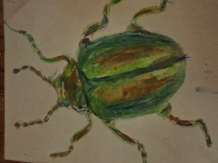 The image displays a watercolor painting of an insect, likely a beetle, rendered from a dorsal perspective on light-toned paper