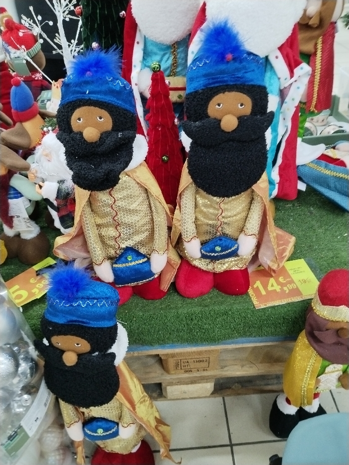 Three plush toy figures of the Three Wise Men are displayed. All wear blue hats with fluffy tops, golden robes, and red shoes. Each has a black beard and holds a small blue bag. Price tags are visible near two of the figures. They stand on a green surface that is placed on top of a wooden pallet. Christmas decorations and other plush figures are in the background. The floor is white tiled.