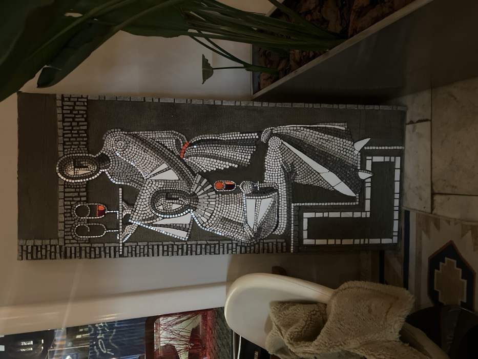 This image depicts an indoor scene in Rostov-on-Don, Russia. The primary subject is a large, vertical mosaic panel, approximately 2 meters in height, centered within the frame. The mosaic portrays two stylized human figures rendered in grey, white, and limited reddish-orange mosaic tiles against a dark grey, textured background with a block-patterned border. The upper figure, standing, holds a tray with two wine glasses containing reddish liquid. The lower figure, seated, holds a single wine glass also containing reddish liquid. Both figures exhibit simplified facial features. To the left of the mosaic, a cream-colored chair with a beige, textured throw blanket is partially visible. Behind the chair, an obscured reflection or window shows reddish linear elements and indistinct blue patterns on a distant surface. To the right of the mosaic, a rectangular, dark grey planter contains a tall green plant with broad leaves. The floor is covered with light-toned, irregularly shaped tiles with visible grout lines, transitioning to a patterned rug segment on the far left. The wall directly behind the mosaic is a plain, light color. The scene is illuminated by indirect lighting, causing specular reflections on the mosaic's lighter tiles.