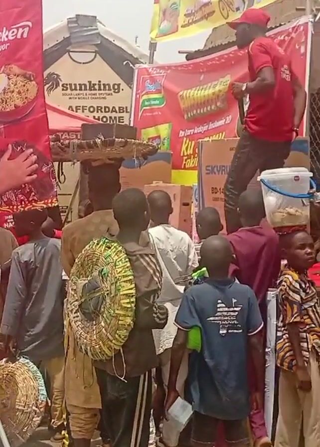 group of people gathered around a promotional event. A man wearing a red shirt and a red cap stands atop a pile of cardboard boxes, addressing the crowd with a microphone. He is framed by promotional banners for food products and solar power systems. The crowd mainly consists of children, many of whom are looking up at the man on the boxes. One person in the crowd is carrying a large circular object made of woven material on their back. The event appears to be taking place outdoors in a crowded, possibly urban, area. The camera angle is from the perspective of someone within the crowd.