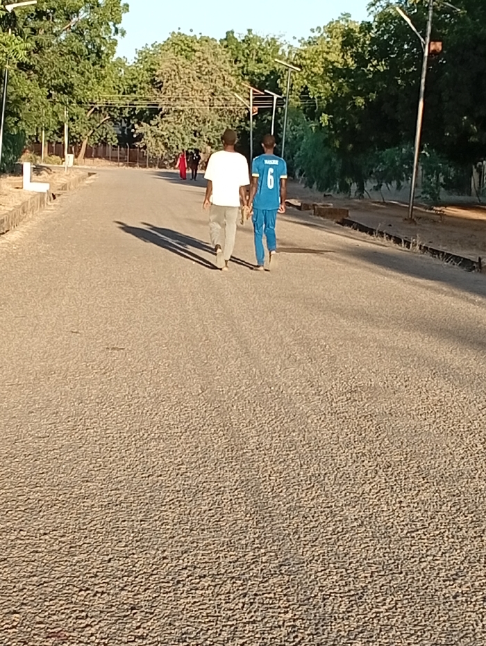 Two barefoot men walk away from the camera on an asphalt road. The man on the left wears a white t-shirt and grey pants. The man on the right wears a blue jersey with the number 6. Their shadows trail behind them. Trees and streetlights line both sides of the road. In the distance, another person in red clothes walks in the same direction.