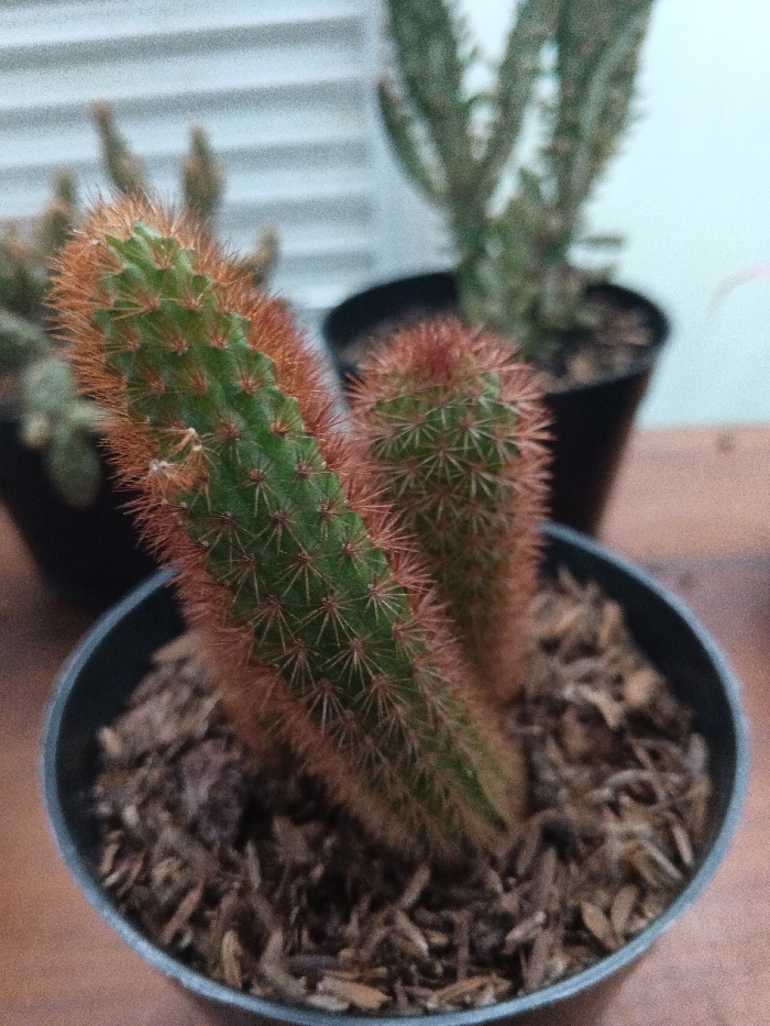 - "A close-up shows two green cacti covered in reddish-orange spines, planted in a black pot filled with brown wood chips" by FM-tWHBz1, licensed under CC BY 4.0
