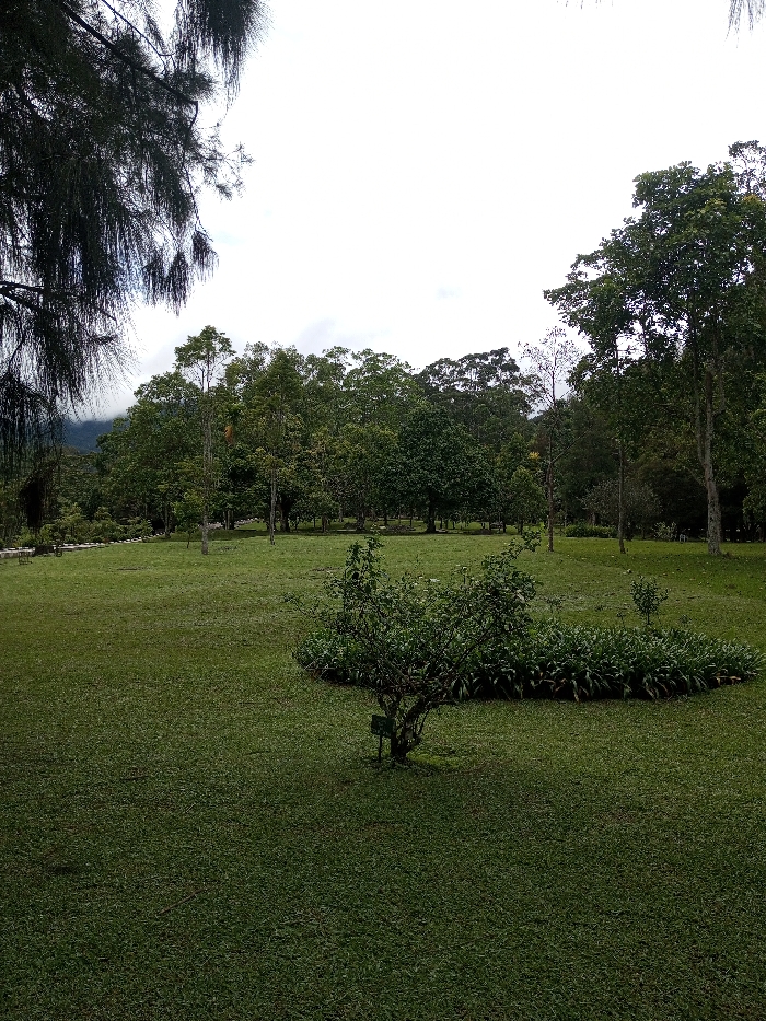 Lush green lawn extends towards a dense forest backdrop. A small tree with a sign stands in the foreground, surrounded by a bed of plants. The forest features varied tree heights and types, with a hint of mountain visible through the clouds. A tree with drooping foliage frames the scene on the left, while another tree stands prominently on the right. The sky is overcast and muted.