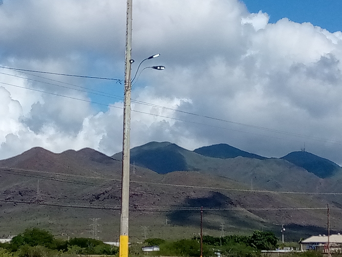 A landscape features a tall, grey light pole with two luminaires, partially obscuring a view of mountains under a partly cloudy sky. The mountains are varied in color from brown to green, with a radio tower visible on the furthest peak. Power lines stretch across the frame, adding a sense of man-made infrastructure to the scene. Vegetation dots the lower slopes, transitioning to a sparse foreground.