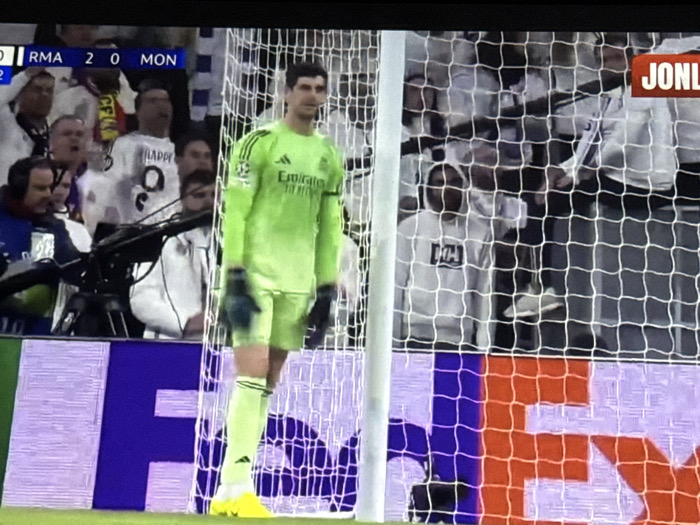 Thibaut Courtois, the Real Madrid goalkeeper, stands by the goalpost wearing a neon green uniform and black gloves. The score is RMA 2-0 MON. Behind the goal, spectators are visible, some wearing white. A cameraman and camera stand nearby. The goal's net is in the foreground with a FedEx advertisement below.