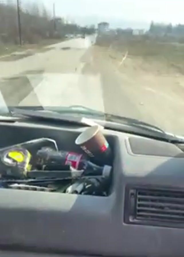 person driving in a car on a paved road. The dashboard is cluttered with various items, including a cup and a can. The road ahead appears to be leading out of town. As the car drives, the video pans to show the scenery outside. There are open fields and distant hills under a partly cloudy sky with the sun shining.