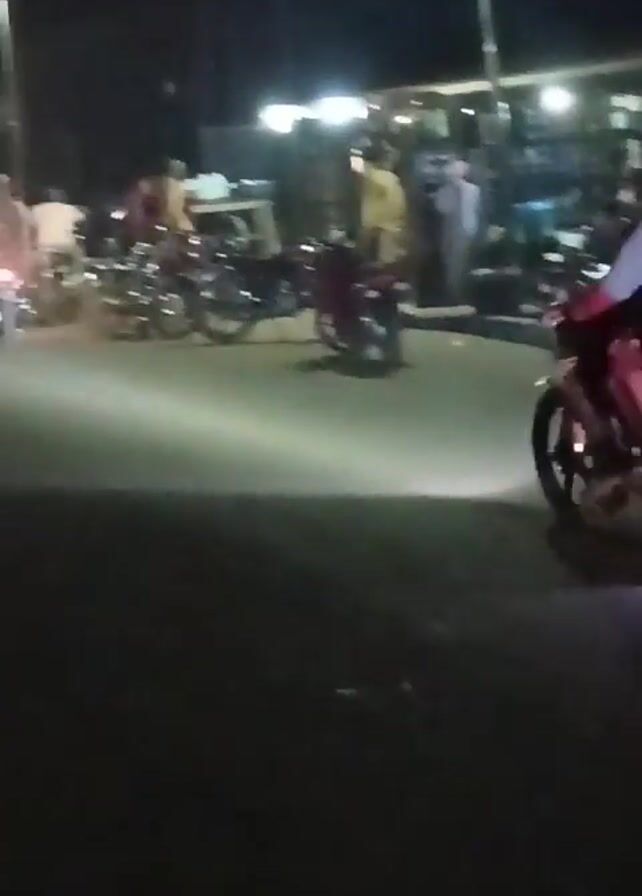 poorly lit street scene at night. Multiple motorcycles are parked along the side of the street. Several people are standing and milling about, mostly near what appears to be a small building or shop. The street is paved and there are streetlights illuminating the scene. Motorcycles are moving on the street, their headlights and taillights visible. The image quality is grainy and shaky.
