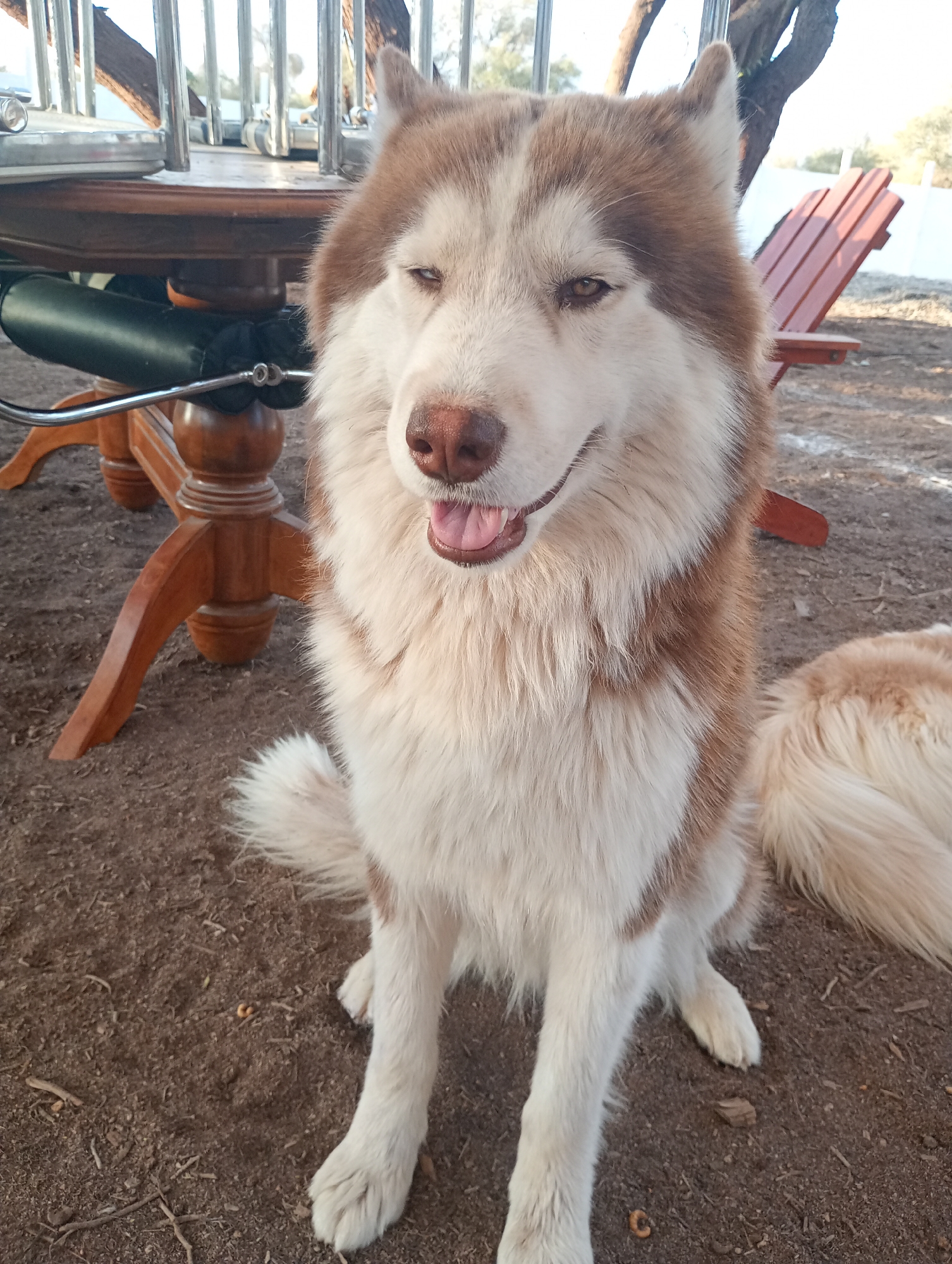 A medium shot depicts a brown and white Siberian Husky sitting on dirt under a table
