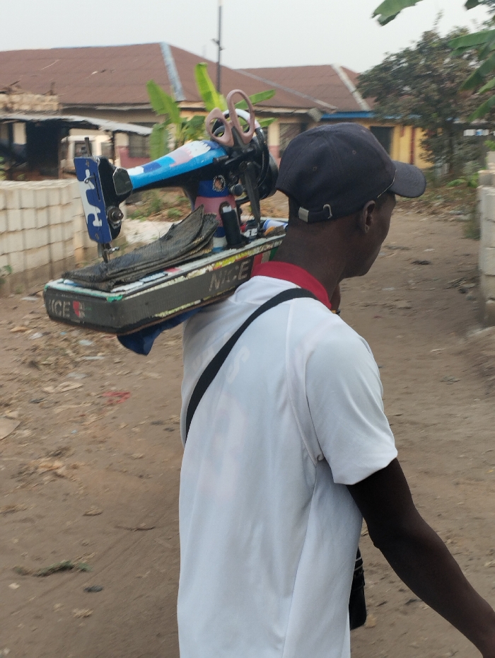 A person wearing a white shirt and a black cap carries a colorful, possibly repurposed sewing machine on their shoulder. The sewing machine, decorated with playful patterns and the word "NICE", also holds a pair of scissors. The individual walks along a dirt path in a residential area with simple buildings in the background. The overall scene suggests a blend of resourcefulness and creativity within a modest environment.