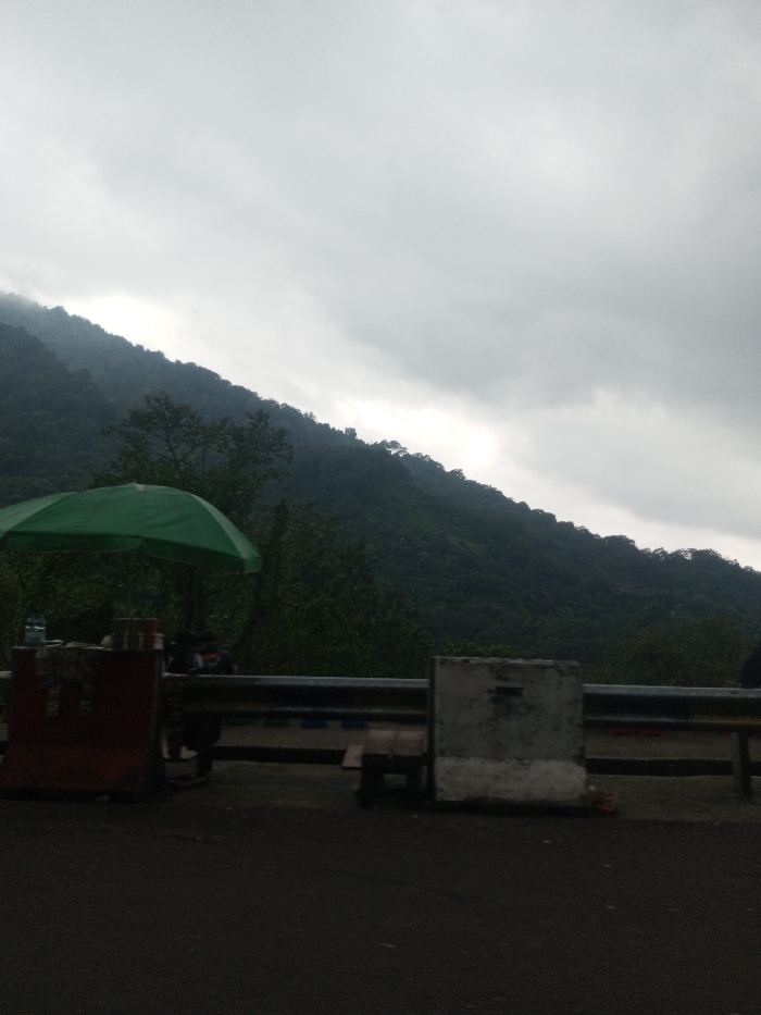 The image captures a roadside scene on an overcast day, likely in a hilly or mountainous area near Jabalpur, India. The upper half of the frame is dominated by a grey, cloudy sky. Below this, a densely forested hillside, dark green in color, slopes from the upper left towards the lower right. Mist or low clouds are visible near the crest of the hill on the left. In the foreground, a section of dark asphalt road is visible. A metallic guardrail, primarily silver or light grey with some darker horizontal sections, runs across the mid-ground, separating the road from the natural terrain. To the left, a bright green open umbrella extends upwards, sheltering a temporary roadside stall. This stall consists of a reddish-brown rectangular barrier or counter, with a clear plastic water bottle visible on its surface. Several indistinct human figures are partially visible behind this counter and under the umbrella, suggesting the presence of vendors or individuals associated with the stall. Further to the right along the guardrail, a light grey concrete block barrier is present, positioned upright. A small, dark wooden stool or box is situated in front of this concrete block. Additional indistinct human figures are faintly discernible further to the right, behind the guardrail.