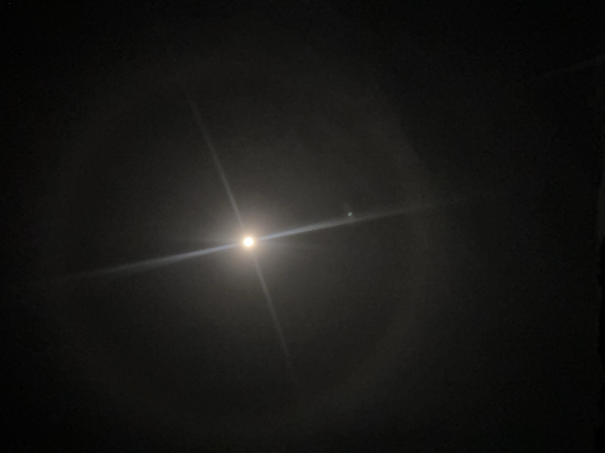 The image depicts a night scene in Chepintsi, Bulgaria. A bright light source, likely the moon, dominates the center of the frame, casting a strong glare and radiating light streaks across the dark sky. The surrounding environment is obscured by darkness, with subtle hints of fog or haze present. A faint circular halo effect is visible around the central light, suggesting atmospheric conditions. The overall impression is one of a dark, slightly hazy night with a prominent celestial object.