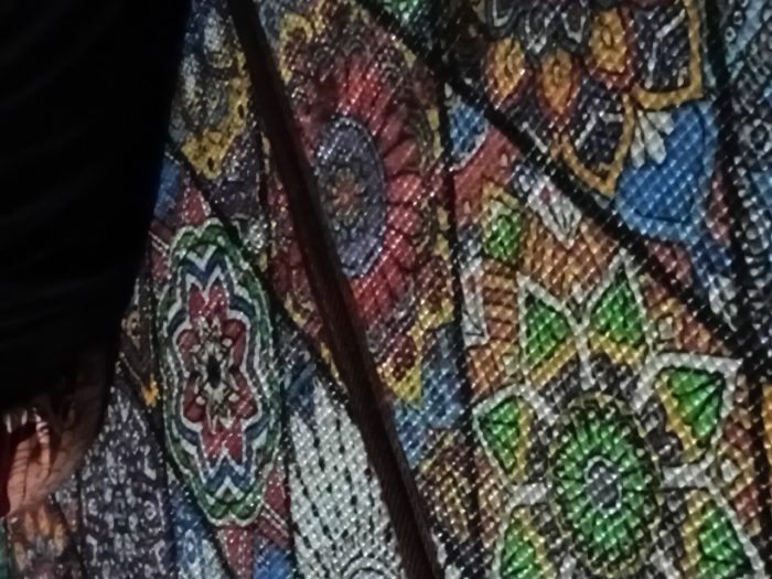 A close-up captures an intricate, colorful pattern with repeating floral and geometric designs