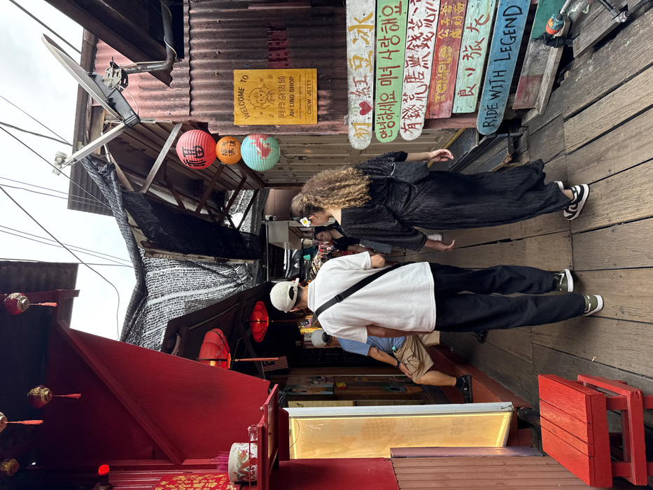 This image shows a street scene with various elements. There are signs in different languages, including Korean and Japanese, with phrases like "Ride with Legend" and greetings. A sign reads "Welcome to Ah Ling Shop." Lanterns are strung above the street. People are walking on a wooden walkway. There's a mix of architectural styles with corrugated metal roofing and red wooden structures. A satellite dish is visible on one of the buildings.
