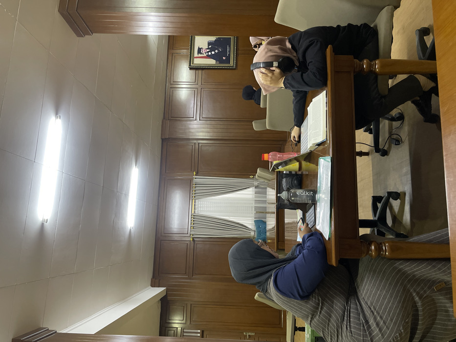 The image depicts an interior scene, identified as being in Muka, Indonesia, likely a study hall, library, or office