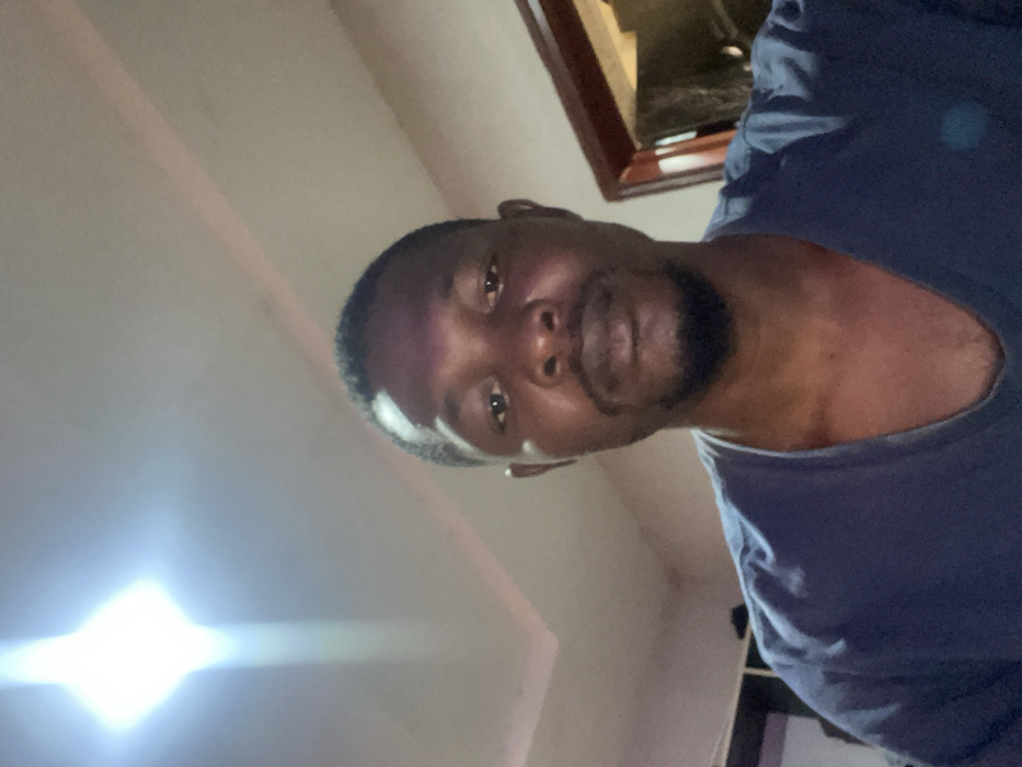 A man with dark skin and short hair faces the camera, tilted at an angle