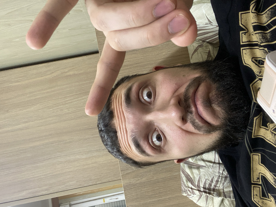 A bearded man makes a silly face with his eyes wide and lips puckered, and holds his fingers up, gesturing. The photo is taken at an angle with the man's head tilted to the right. He is lying on a patterned pillow or blanket. He wears a black t-shirt with a gold design on the front. The background shows a beige wooden surface.