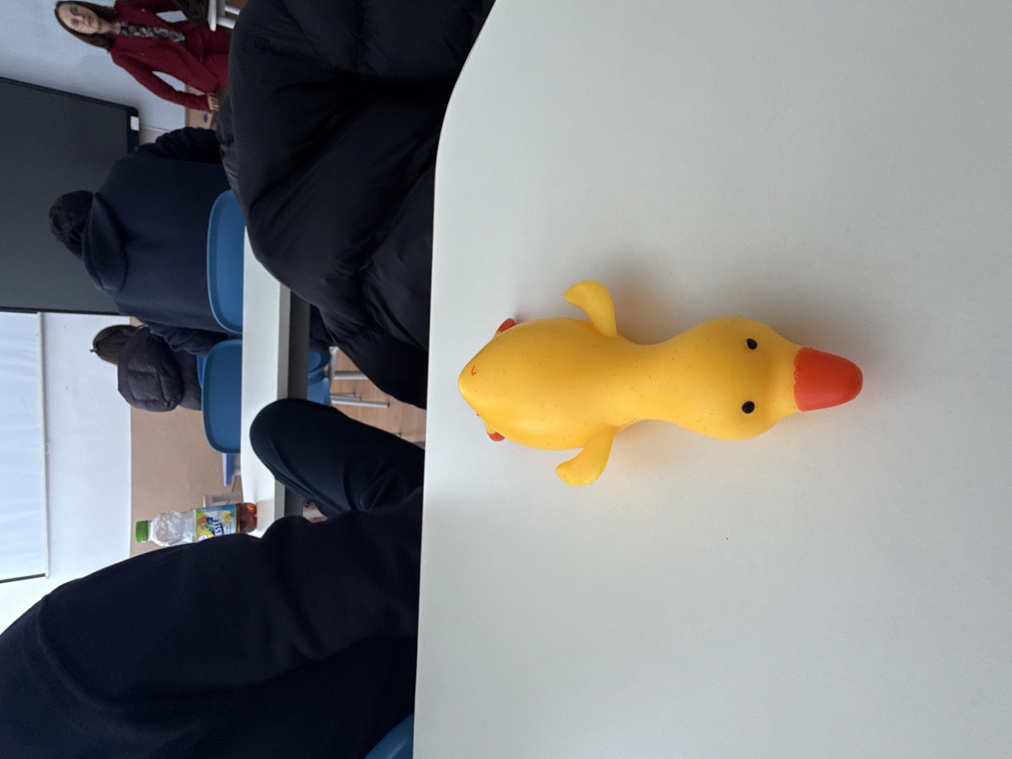The image depicts an indoor scene within a classroom or lecture hall, located in Blagoevgrad, Bulgaria. In the immediate foreground, a yellow rubber duck toy with an orange beak and two small black eyes rests centrally on a white tabletop. The perspective is from a low angle, showing the upper portion of a white table extending across the bottom of the frame. To the left, the dark blue sleeve and shoulder of a person are partially visible, indicating a seated individual. To the right, a segment of a black puffer jacket belonging to another seated person is present. Further back, on another white table, a clear plastic bottle with a green cap and a visible "Fruity" label, containing an amber liquid, stands. Behind this table, two individuals are seated in blue chairs with their backs to the camera. One wears a dark hooded sweatshirt, and the other a dark, possibly padded, jacket. In the background, a large, dark rectangular screen or display is mounted on a light-colored wall. To the far right, a woman with long, dark hair, dressed in a red blazer over a patterned top, stands. Her gaze appears directed towards the center-left of the room. The overall environment features light-colored walls and multiple white tables with blue chairs, consistent with an educational setting.