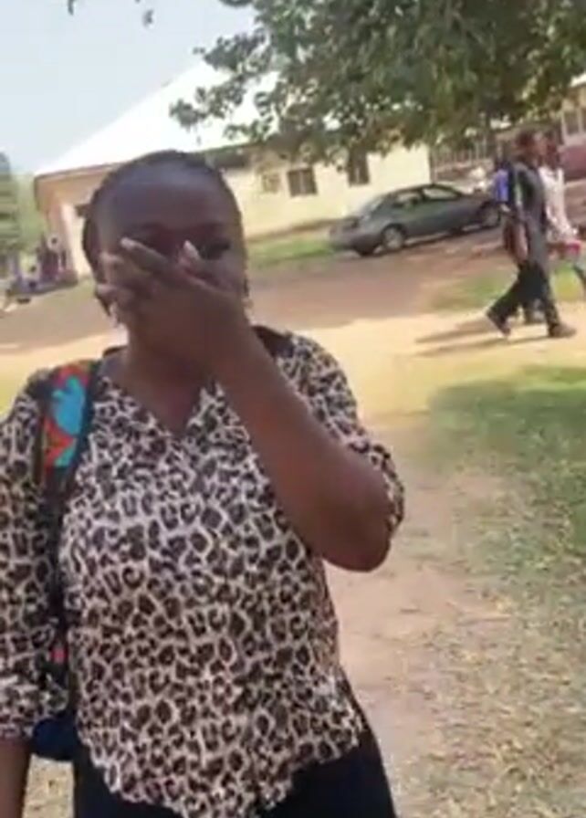 woman outdoors, standing in a grassy area with buildings and trees in the background. She has dark hair styled in braids, and she is wearing a leopard print shirt and black leggings. She has a colorful backpack on and is holding a phone in her hand. She is smiling and covers her mouth with her hand, seemingly trying to contain her laughter. Other people can be seen walking in the background.