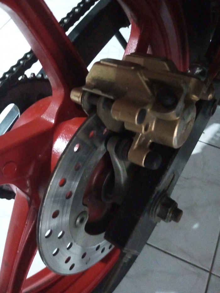 A close-up shows the rear wheel and braking system of a motorcycle. A red, five-spoked wheel is visible with a black chain and sprocket. A silver disc brake is mounted to the wheel's hub. A gold-colored brake caliper is attached to the motorcycle's black swingarm. The swingarm is secured with a nut and bolt. The background shows a white tiled floor and part of a wall.