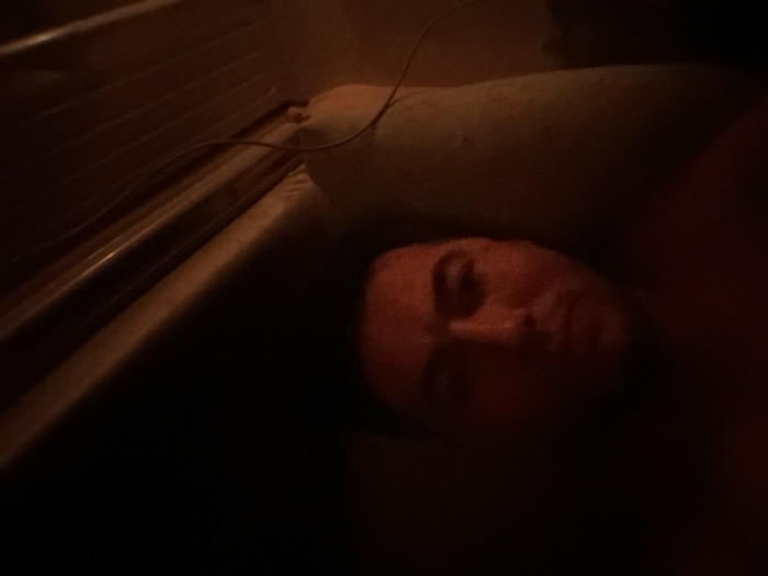 A person is lying in a bathtub. Their head rests on a pillow. The scene is dark, illuminated by a dim, warm light source. The bathtub's side is visible on the left, its lines suggesting a built-in design. A wire or cord runs along the top of the bathtub, near the pillow. The person's face is partially obscured by shadows, but their eyes and facial features are discernible.