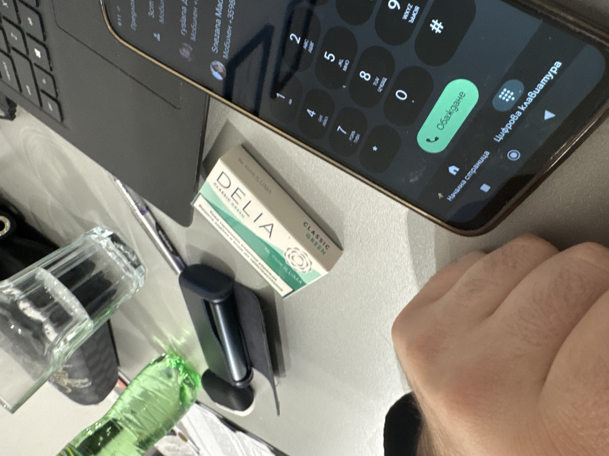 The scene depicts a cluttered desk environment. A black laptop and a black smartphone showing a dial pad are prominent. The smartphone's screen displays a dialing interface with Bulgarian text: "Обаждане" (Call), "Цифрова клавиатура" (Numeric keypad), "Начална страница" (Home page), and contact information. A white pack of "DELIA CLASSIC GREEN ILUMA" cigarettes lies next to the phone, along with a dark blue IQOS device. A clear glass container and a green plastic bottle are also visible, suggesting consumption habits. A hand is partially visible. It's impossible to determine the exact location in Sofia, Bulgaria, from the image alone.