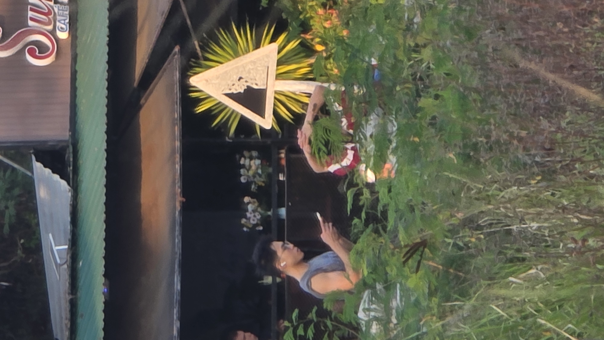 A man is standing next to a cafe sign, looking at his phone. The cafe sign reads "Sun Cafe". A triangular sign with a wave-like design points to the right. The scene is surrounded by foliage. The photo appears to be taken in Nha Trang, Vietnam, based on the style of the cafe signs.