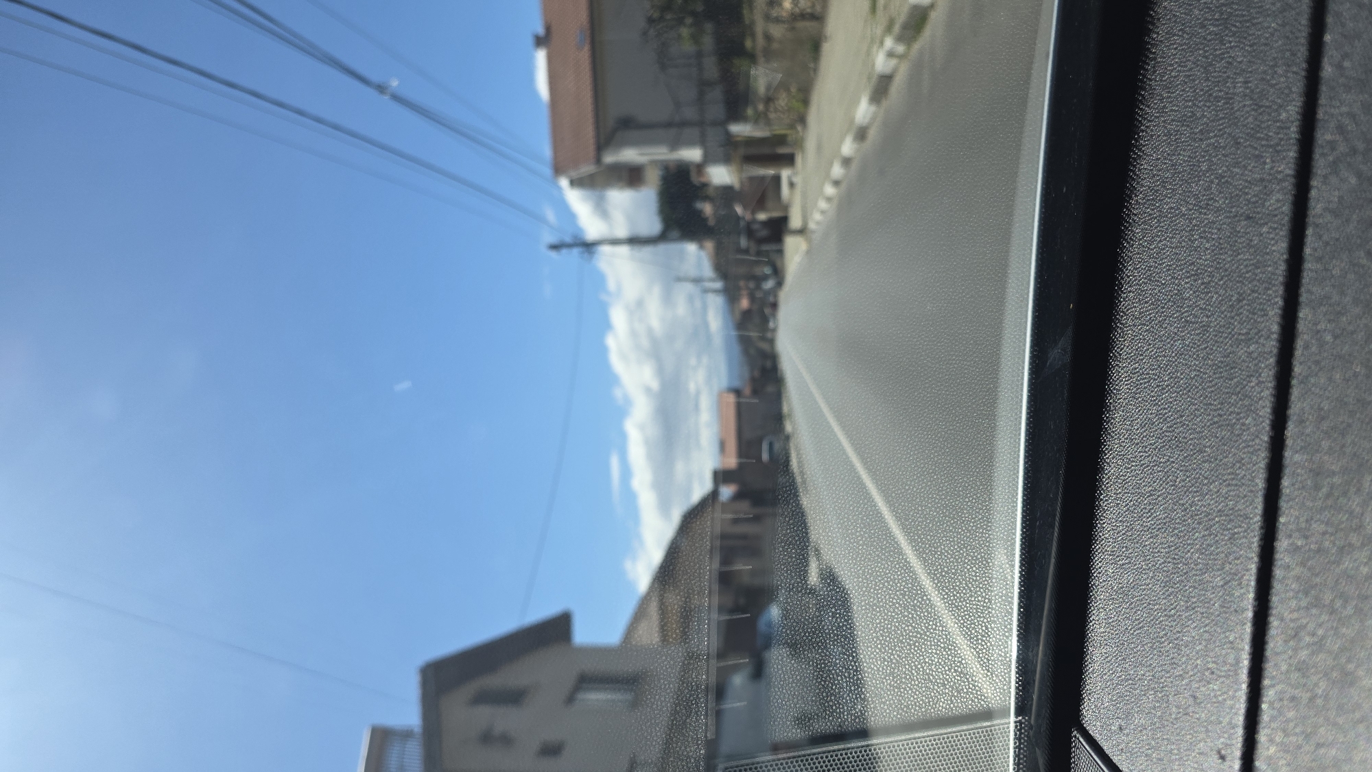 The image depicts a view from inside a vehicle traveling on a road in what appears to be Kocherinovo, Bulgaria. Outside, the sky is bright blue with scattered clouds. Buildings line the road. Power lines are visible against the sky. The road is gray asphalt. The interior of the car is visible on the right side of the frame, with textured dark gray materials.