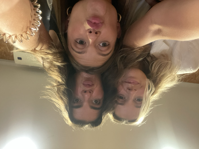 Three young adult females are depicted in a close-up, indoor selfie-style photograph