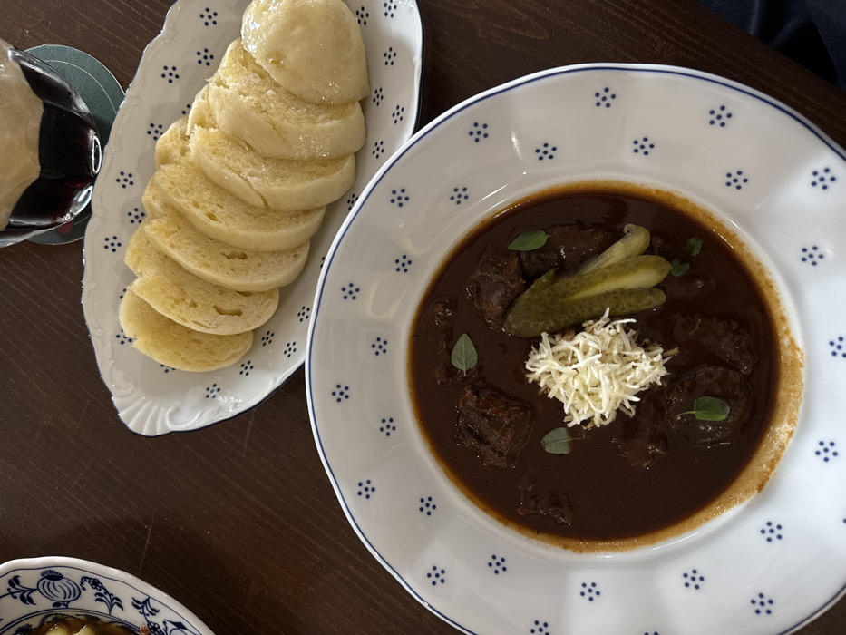 An overhead view captures a dining scene at an unspecified indoor establishment in Stupava, Slovakia. The primary subject is a meal served on a dark brown wooden table. In the foreground, a white circular ceramic bowl, rimmed in blue with repeating blue dot patterns, contains a dark brown meat stew, consistent with goulash. The stew features numerous dark meat chunks and is garnished with a mound of light, shredded cheese, two green gherkin slices, and several small green herb leaves. To the upper right, an elongated white ceramic plate with a scalloped edge and similar blue dot patterns holds seven slices of light-colored steamed bread dumplings, arranged in a line. Partially visible in the upper right corner is a clear glass containing a dark red liquid, likely red wine, resting on a dark green coaster. A fragment of a third white ceramic plate with an intricate blue floral pattern is visible in the upper left corner. No individuals are depicted.