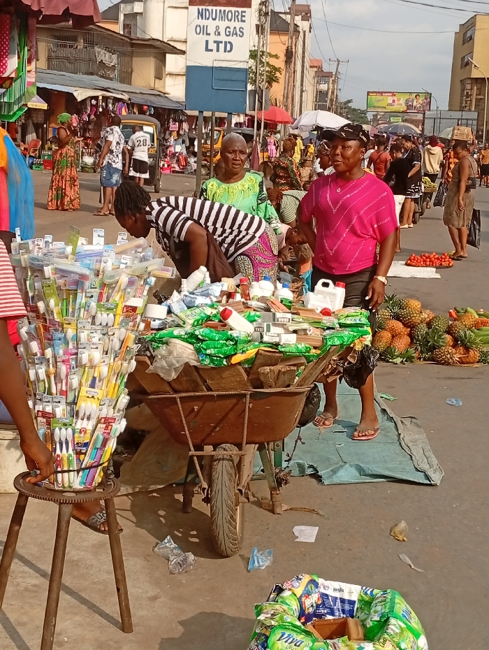 A bustling market scene shows people surrounding a vendor's cart overflowing with various goods, including toothbrushes, toiletries, and food items like pineapples and tomatoes. Two women are positioned behind the cart, one in a pink shirt and the other in a green patterned top. Another person wearing a striped shirt leans over the cart examining the wares. An "NDUMORE OIL & GAS LTD" sign is visible in the background, suggesting a commercial area. The street is filled with shoppers, creating a lively and dynamic environment.