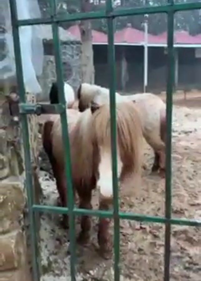three small horses, or ponies, in a muddy enclosure viewed through a green metal fence. The pony closest to the camera is brown with a white blaze on its face and a long, light-colored mane. Behind it, two other ponies, appear to be a lighter, off-white color. A person's hand is briefly seen reaching out to touch the brown pony through the fence. The enclosure is surrounded by a stone wall on the left and a building with a red roof in the background. The ground is muddy and there are bare trees in the background, suggesting a cold or wintery season. A plastic sheet is partially visible attached to the fence.
