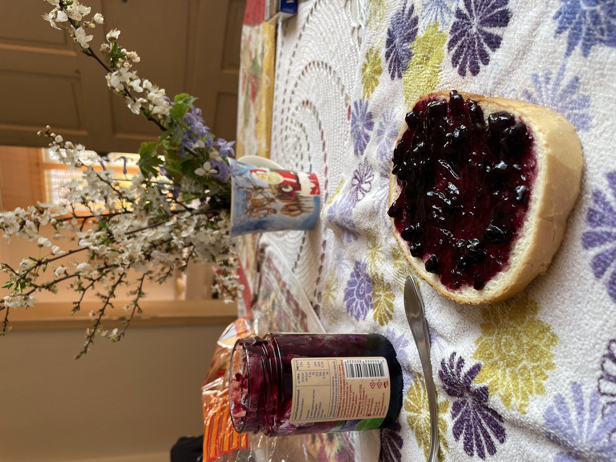 A tabletop scene is depicted in a close-up, tilted perspective. A slice of bread covered in dark jam rests on a floral-patterned cloth. A silver spoon lies alongside. A glass jar of the same jam is positioned at the bottom of the frame. To the left, a bouquet of white flowering branches and blue hyacinths sits in a small mug. Part of a loaf of bread is also visible in a plastic bag. The city of Elena, Bulgaria is not evident in the image.