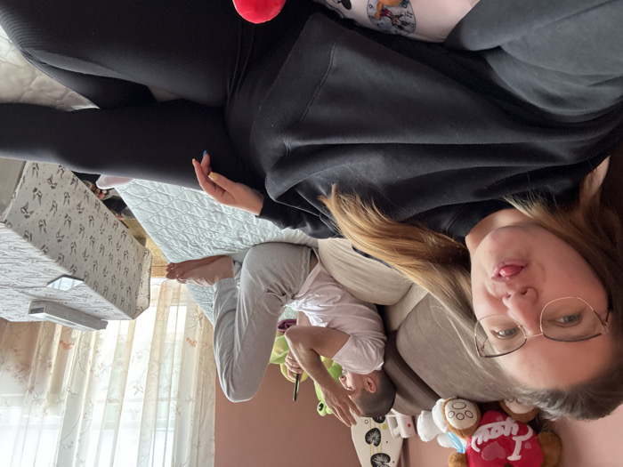 An indoor scene depicts two individuals within a casual residential environment, located in Sofia, Bulgaria. The foreground features a female with long, light brown hair and eyeglasses, wearing a black long-sleeved top and black leggings. She faces the camera, extending her tongue slightly. Her left hand, with multi-colored fingernails, rests on her leg. In the background, a male with short, dark hair lies on his side on a large sofa or bed covered with a light blue quilted blanket. He wears a white t-shirt and light grey sweatpants, holding a green object near his raised right hand while looking away from the camera. His bare feet are visible. The wall behind the sofa is painted light reddish-brown and displays multiple plush toys, including a red heart with 'I love you', a white bear, and a green frog. To the right, a rectangular table draped with a white tablecloth featuring black rabbit illustrations holds a mobile phone and a white rectangular electronic device. A large window with translucent white curtains is visible in the background, providing natural illumination.