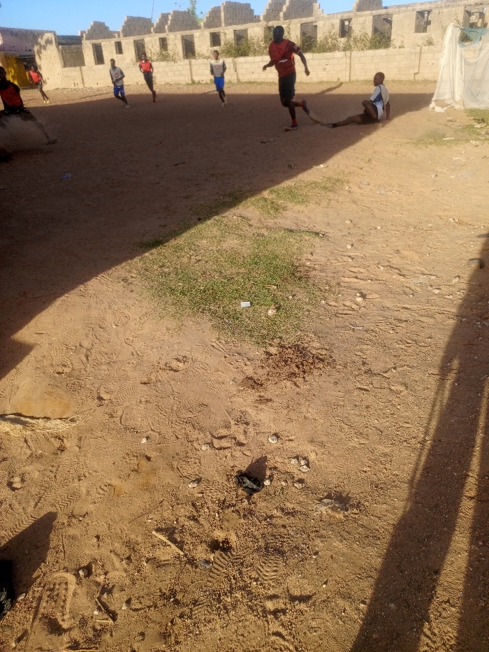 The image displays an outdoor scene in Dabawa, Nigeria, depicting approximately seven young male individuals on a barren, sandy dirt field under clear blue skies. In the background, an unfinished concrete block structure, possibly a building or wall, features multiple empty window openings. To the far right, a white, possibly mesh, tent-like structure is visible. Six individuals are actively engaged, consistent with playing soccer. One male in a red shirt and dark shorts is positioned mid-stride, running towards the right. Another male, wearing a white or light blue shirt and dark shorts, is seated on the ground to the right, leaning back with his left leg extended. Three other males in varied attire (one in a grey shirt, one in a red shirt, one in a light blue shirt) are in the mid-ground, running towards the left. A sixth male in a red shirt is partially visible on the far left, also in motion. The specific object of play (e.g., a soccer ball) is not visible within the frame. The foreground consists of undisturbed sandy ground, featuring sparse patches of green grass, numerous shoe tread marks, and scattered small rocks. A small, dark patch of disturbed earth or debris is located in the mid-foreground, near a piece of white litter and a crumpled dark object. Strong sunlight casts distinct shadows across the lower left foreground and from the individuals.