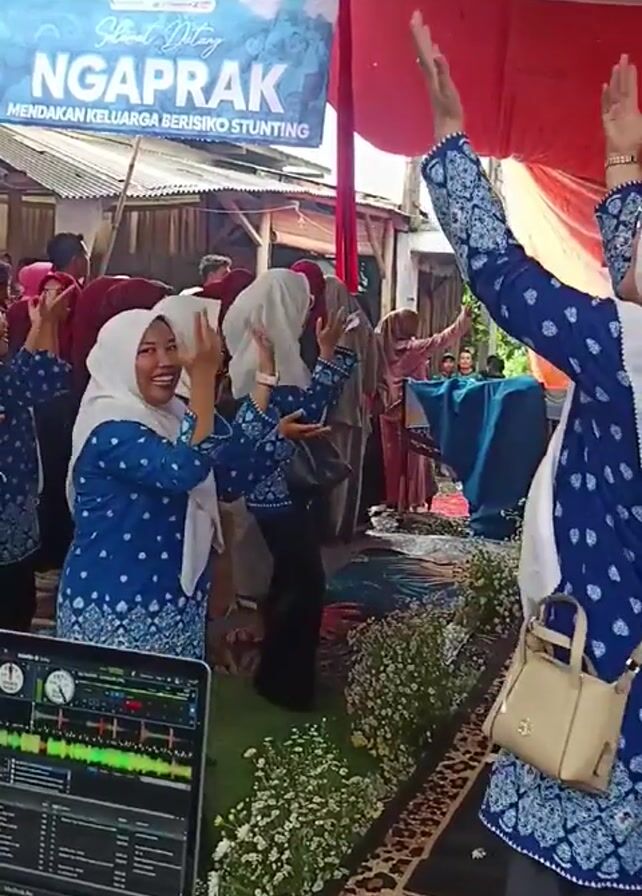 group of women dancing at an outdoor event, likely a community gathering in Indonesia, judging by the language on the banner. The women, dressed in blue patterned tops and hijabs, are clapping and moving to music. A laptop with audio mixing software sits on a table in the foreground, suggesting the event is professionally supported. The setting includes a tent-like structure with red and white fabric, decorated with flowers. There are other people milling around, some filming with their phones. The event seems to be related to raising awareness about stunting, as indicated by the text on the banner.