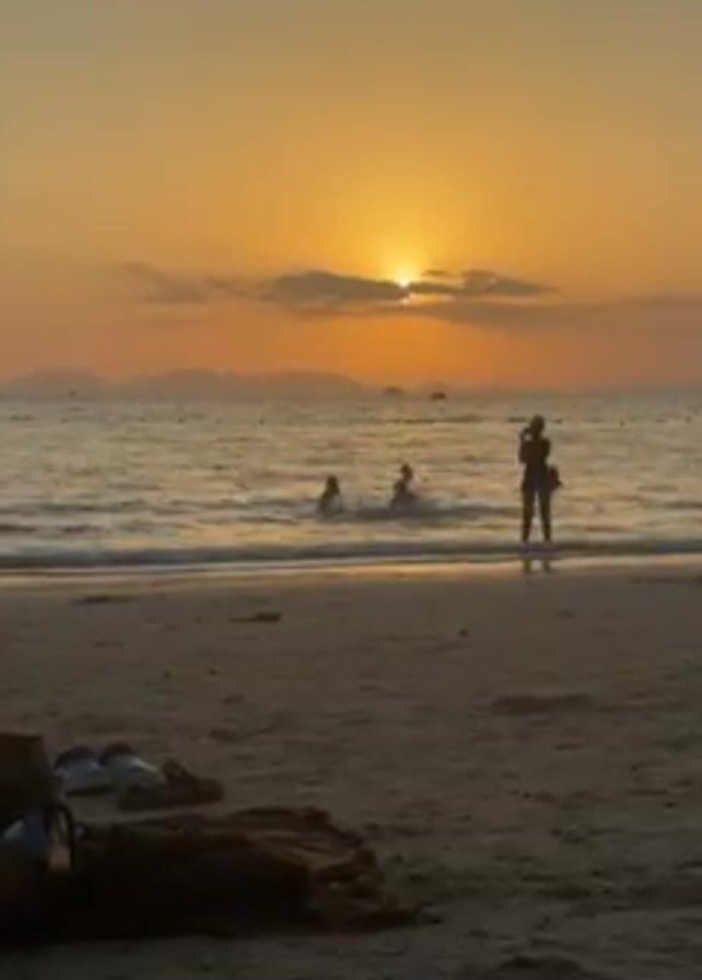 beach scene during sunset. The sun is setting over the ocean, with a few clouds obscuring the lower portion. There are three people silhouetted against the light. Two are in the water, while the third appears to be standing on the beach taking a photo. In the foreground, there's a bag and some footwear scattered on the sand. The overall mood is serene and peaceful.